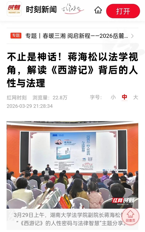 作为央视《百家讲坛》《法律讲堂》等平台的特邀主讲嘉宾,蒋海松教授曾主讲《年话民法典》《典籍中的法治思想》等多部法治文化节目,收获全国观众的广泛关注与好评。此次登上2026岳麓书会的舞台,蒋海松教授围绕其作品《〈西游记〉中的情理法》展开分享。该书基于《百家讲坛》同名讲座整理而成,一经面世便引爆行业与读者圈层,成为兼具学术深度与大众可读性的法律畅销书。