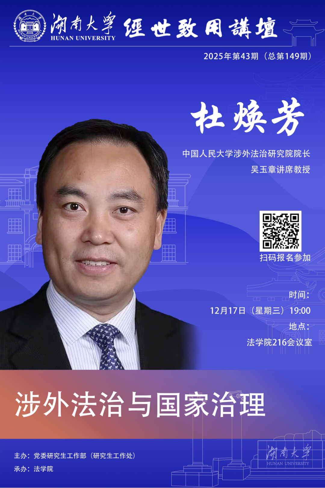 12月17日19:00邀请中国人民大学涉外法治研究院院长、吴玉章讲席教授杜焕芳于云顶娱乐城